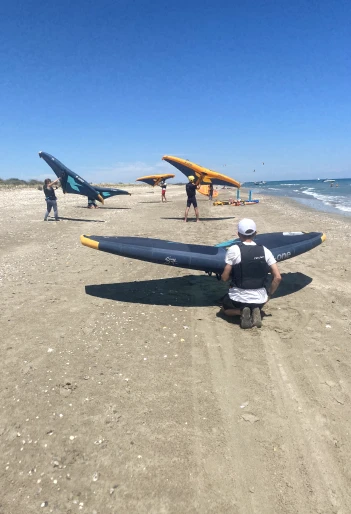 - Préparation et maniement du matériel à terre et sur l’eau : Vous apprenez à gréer votre wing, à préparer le foil et à sécuriser le matériel à la plage par vent fort.