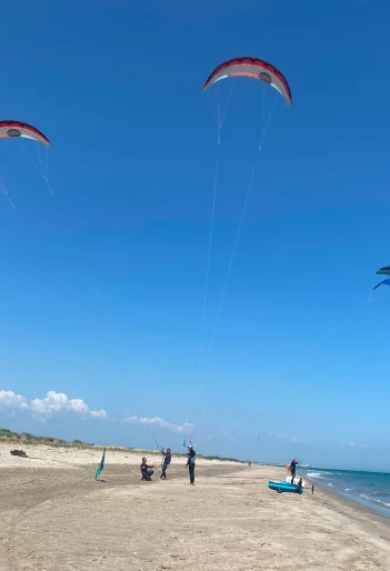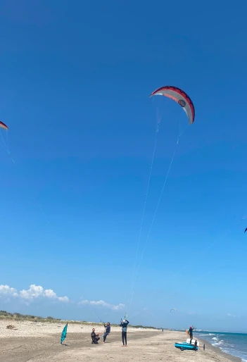 Vor Ort erfolgt die Vorbereitung des Materials (Kites und Boards) am Strand, gefolgt von einem Briefing vor dem Start.